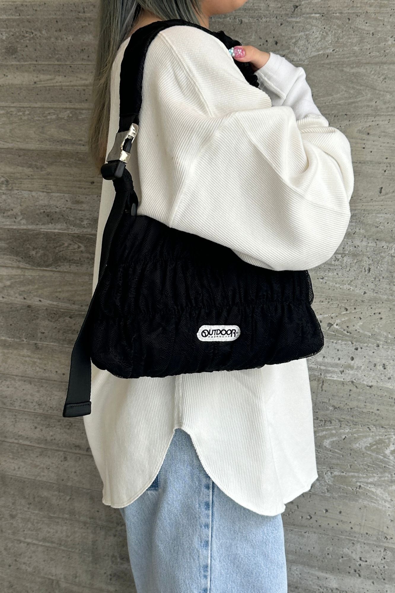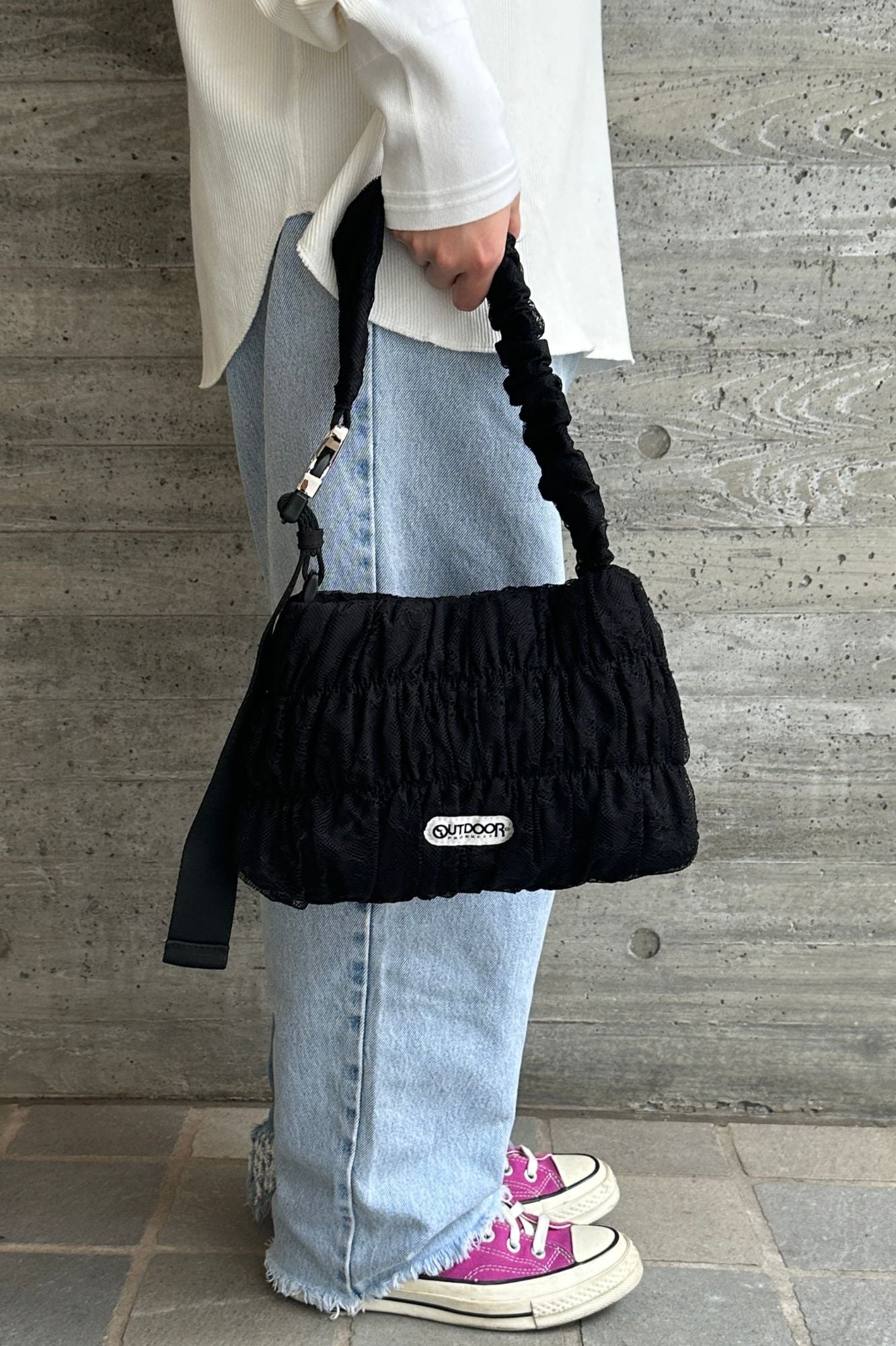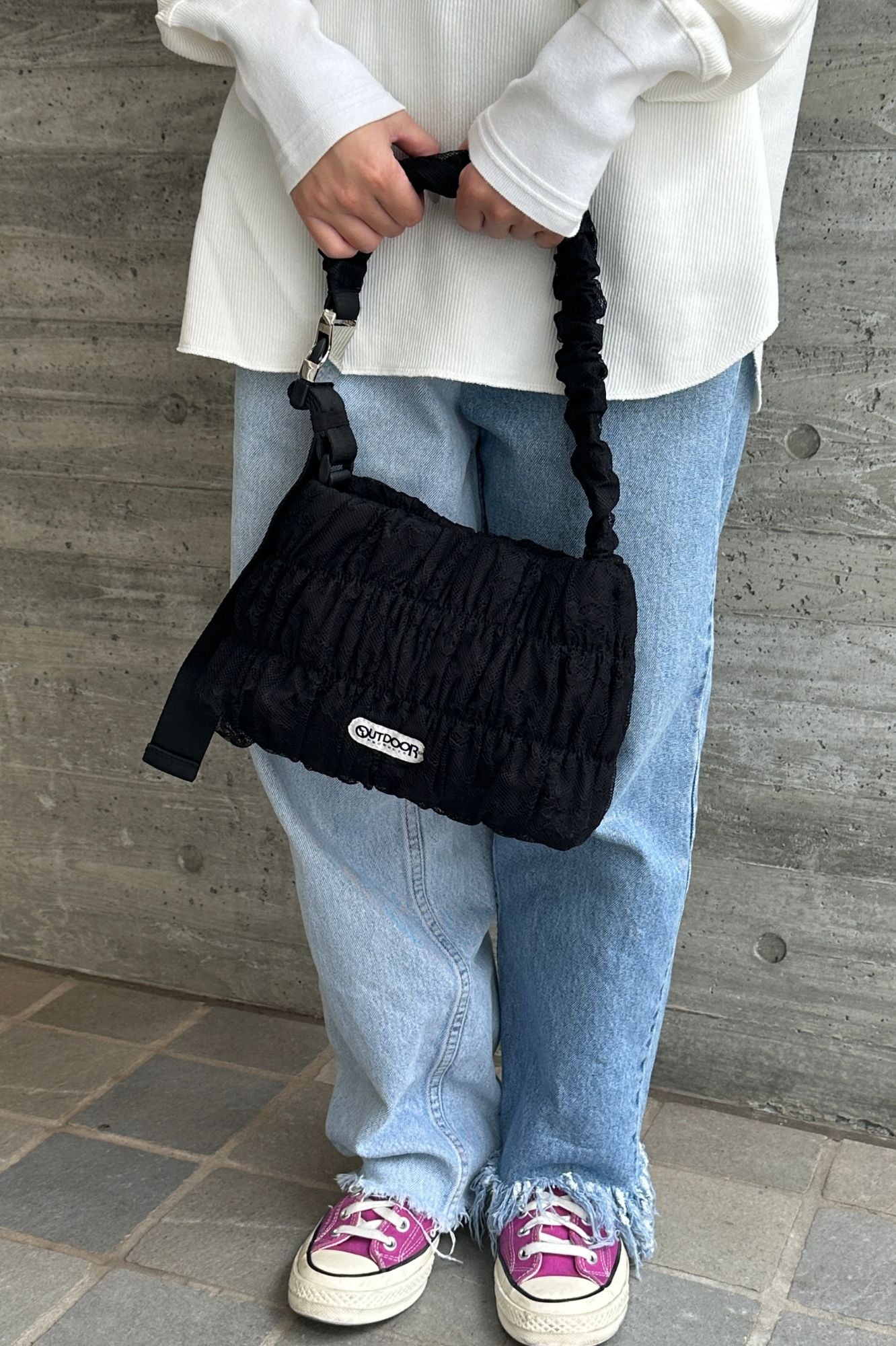 特徴 OUTDOORの定番ショルダーに、レースデザインを落とし込んだトレンドバッグ。
