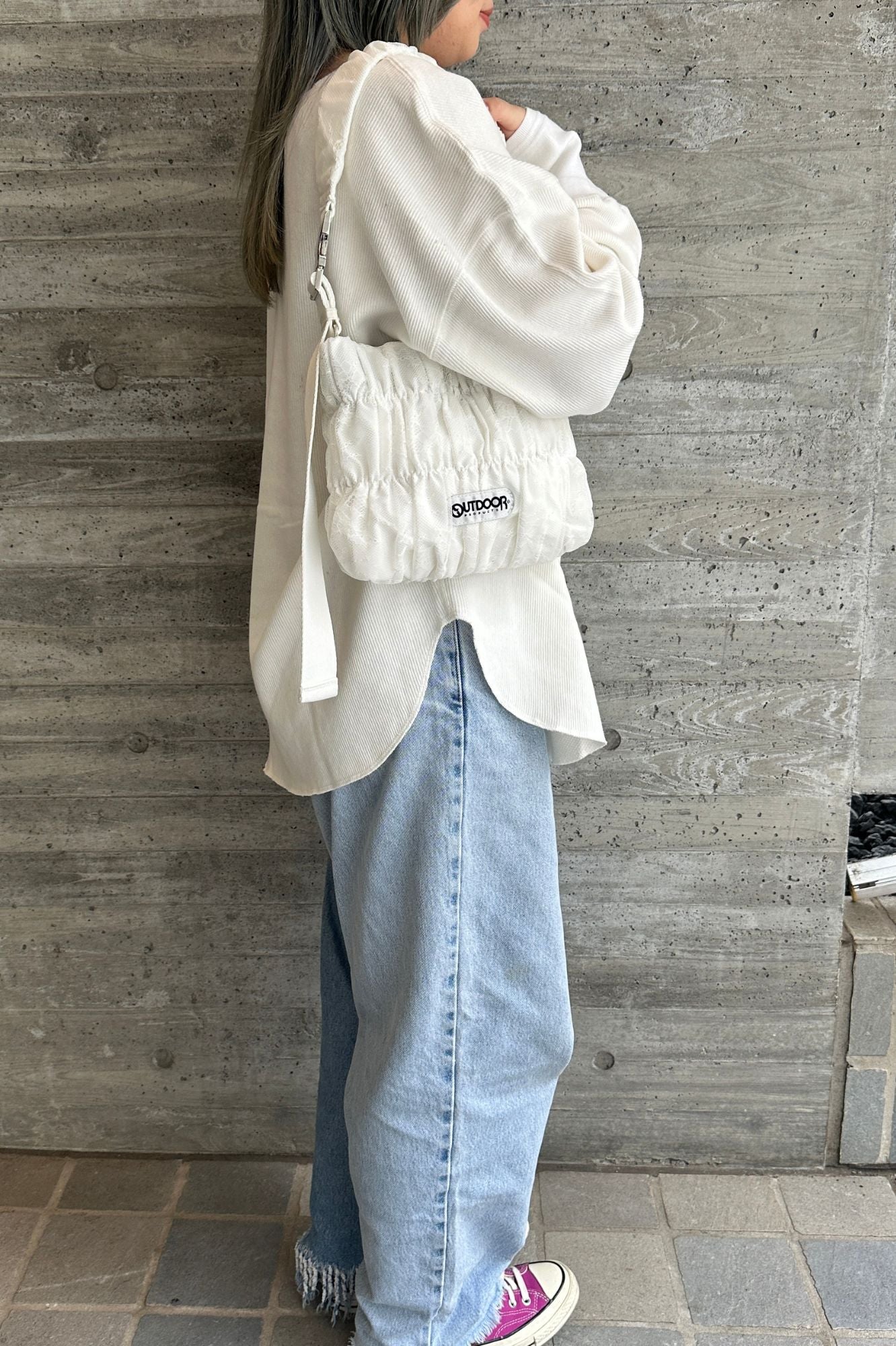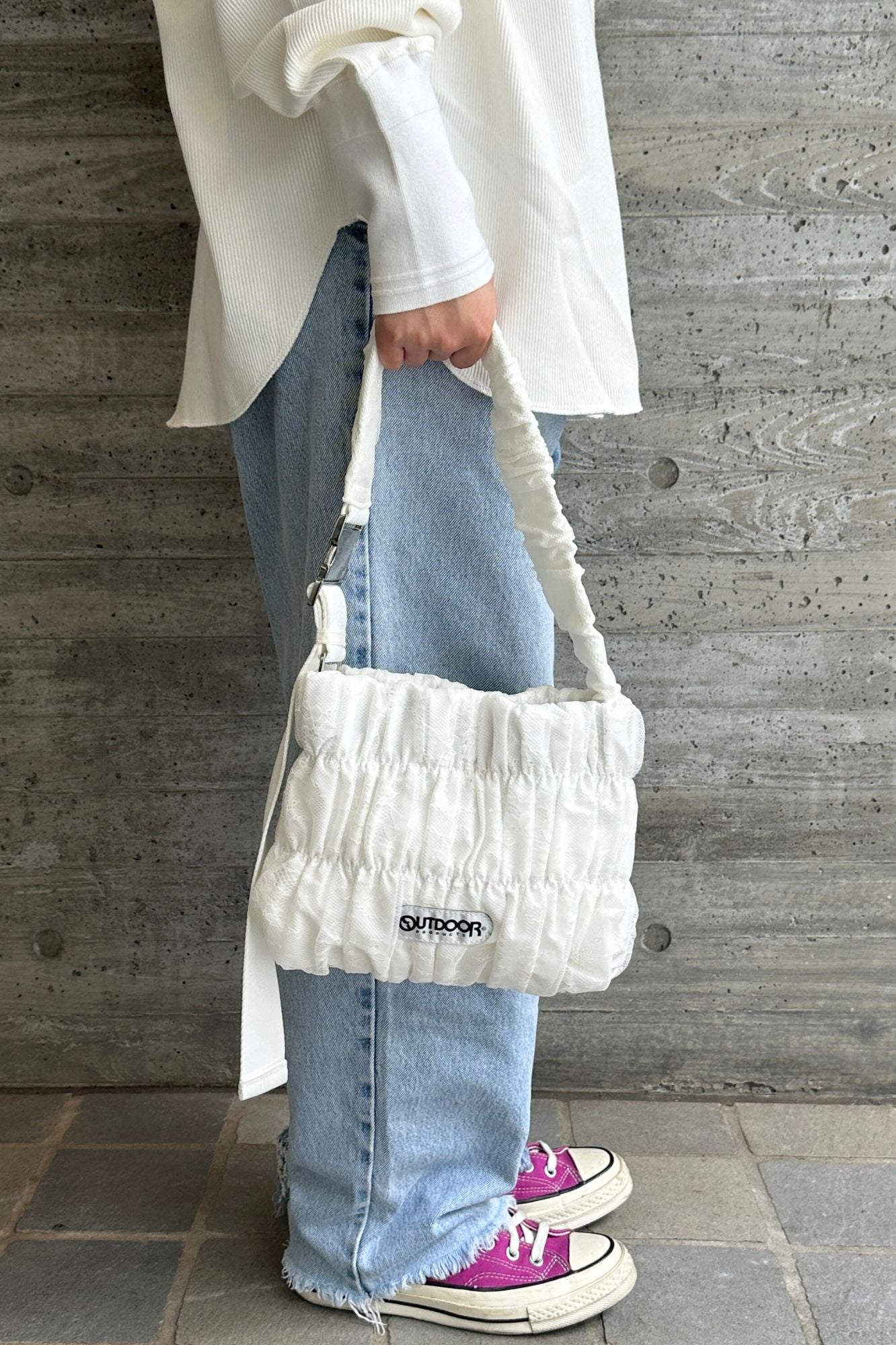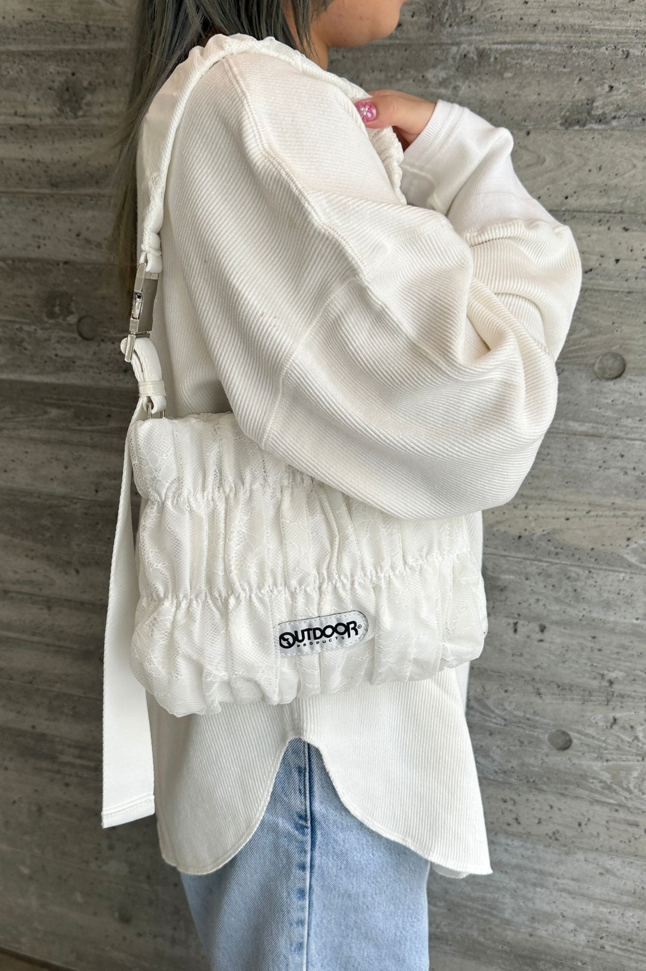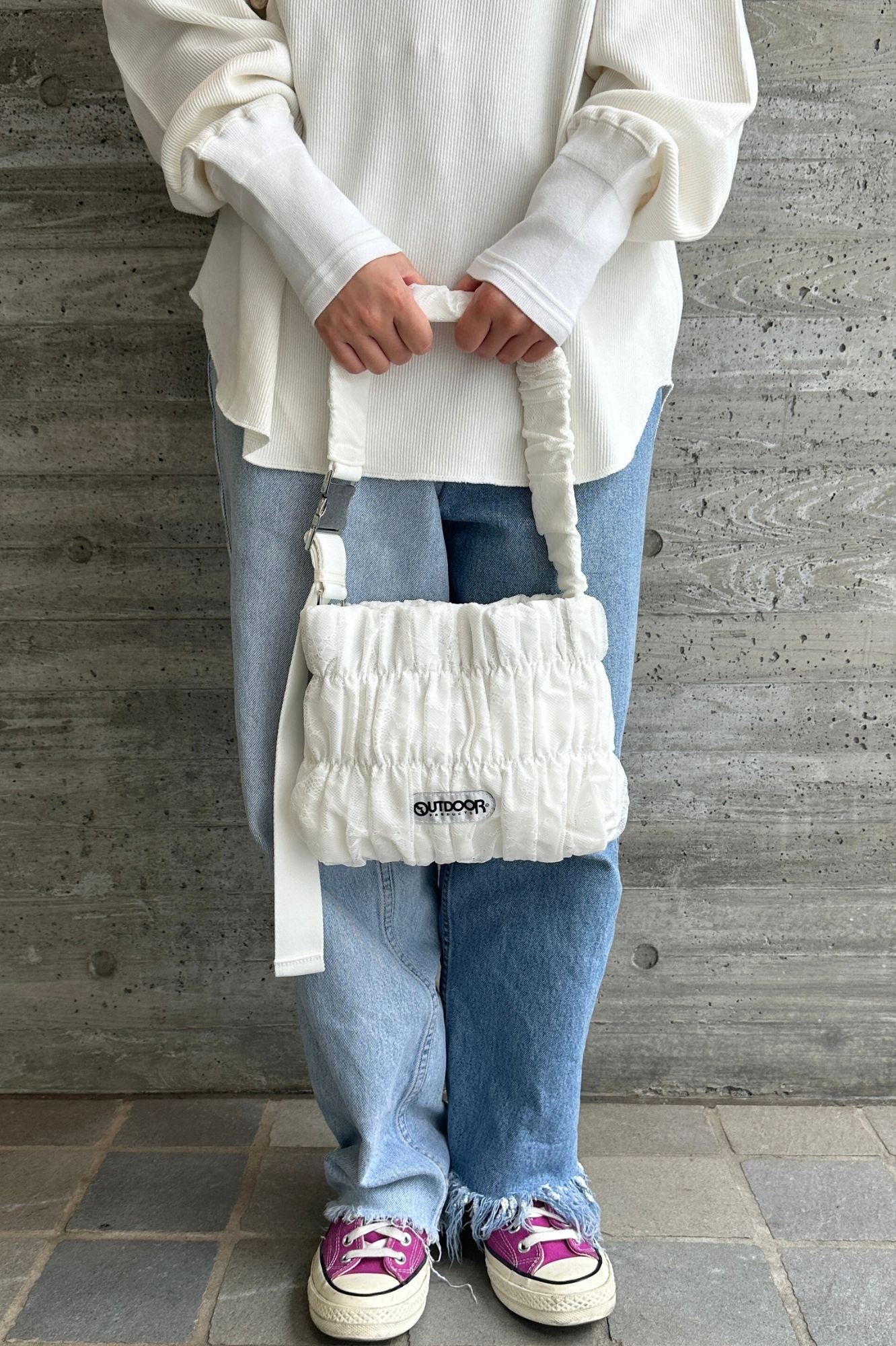 特徴 OUTDOORの定番ショルダーに、レースデザインを落とし込んだトレンドバッグ。